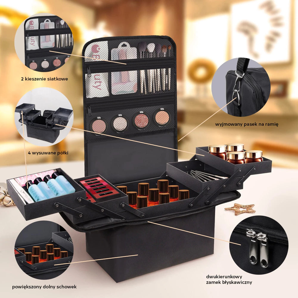 El estuche está equipado con 4 compartimentos plegables, un compartimento principal y 3 compartimentos con cremallera.